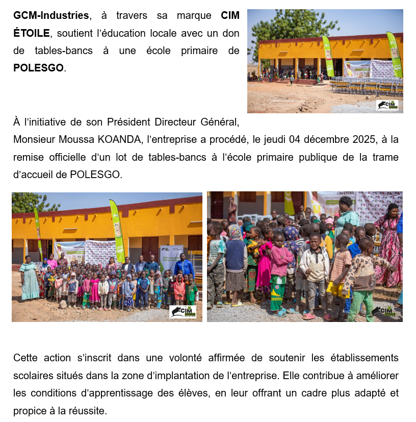 GCM-Industries SA offre des tables bancs à l’école primaire publique de la trame d’accueil de Polesgo Laisser un commentaire / new / Par Mariam MAIGA